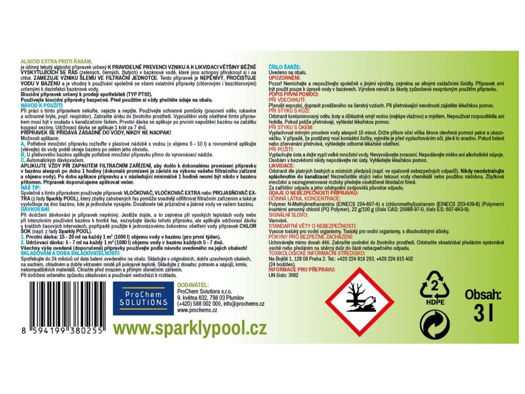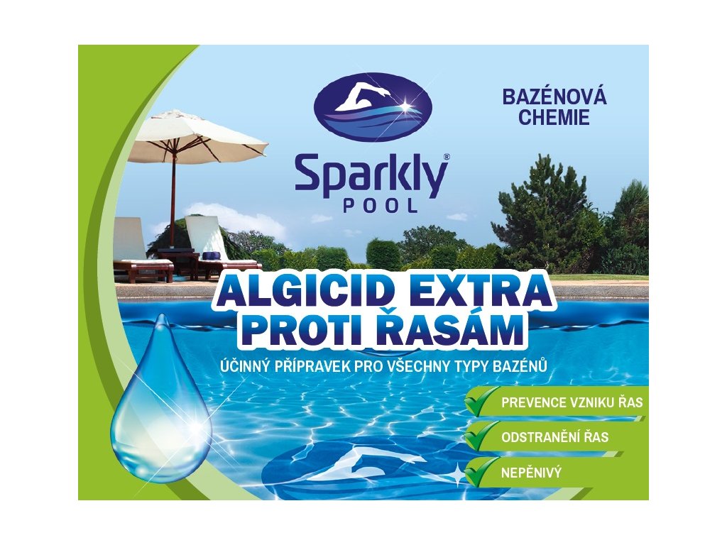 je účinný tekutý algicidní přípravek určený K PRAVIDELNÉ PREVENCI VZNIKU A K LIKVIDACI VĚTŠINY BĚŽNĚ VYSKYTUJÍCÍCH SE ŘAS (zelených, černých, žlutých) v bazénové vodě, které jsou schopny přivyknout si i na chlor. ZAMEZUJE VZNIKU ŠLEMU VE FILTRAČNÍ JEDNOTCE. Tento přípravek je NEPĚNIVÝ, PROČIŠŤUJE VODU V BAZÉNU a je vhodný k používání společně se všemi ostatními přípravky (chlorovými i bezchlorovými) určenými k dezinfekci bazénové vody.