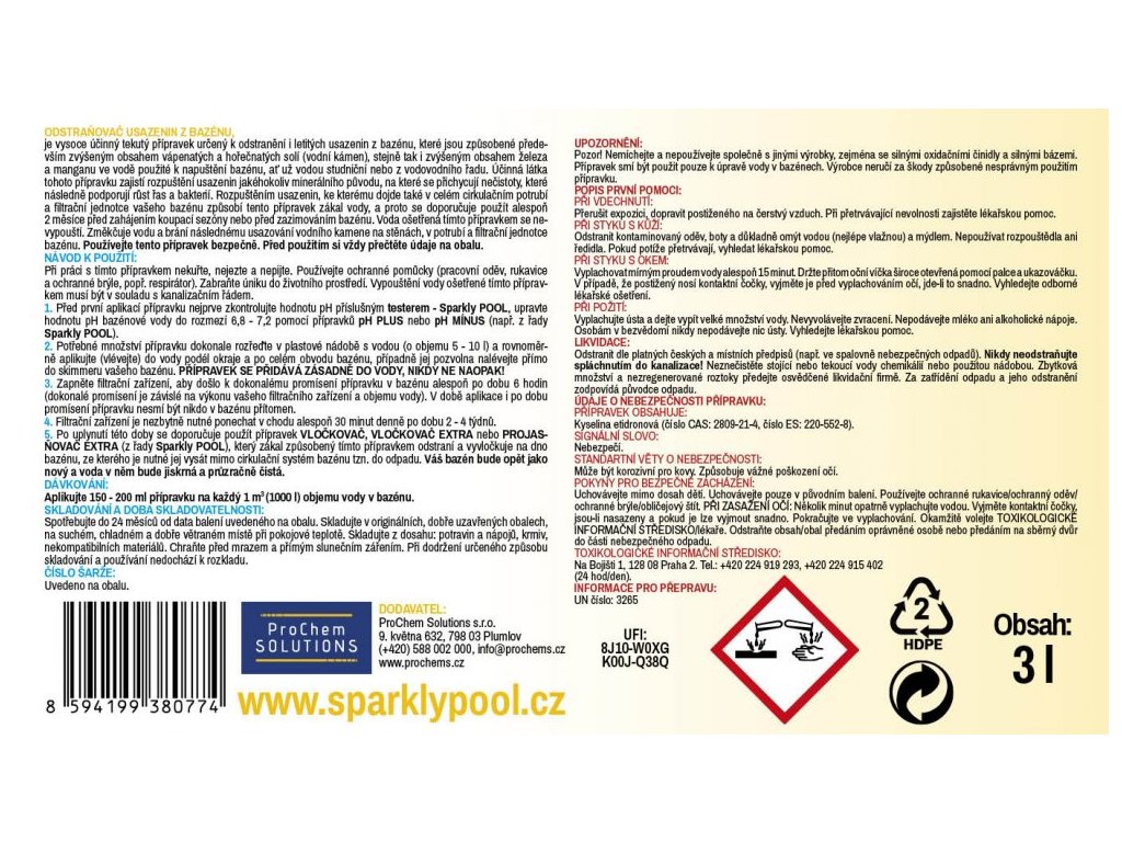 je vysoce účinný tekutý přípravek určený k odstranění i letitých usazenin z bazénu, které jsou způsobené především zvýšeným obsahem vápenatých a hořečnatých solí (vodní kámen), stejně tak i zvýšeným obsahem železa a manganu ve vodě použité k napuštění bazénu, ať už vodou studniční nebo z vodovodního řadu. Účinná látka tohoto přípravku zajistí rozpuštění usazenin jakéhokoliv minerálního původu, na které se přichycují nečistoty, které následně podporují růst řas a bakterií. Rozpuštěním usazenin, ke kterému dojde také v celém cirkulačním potrubí a filtrační jednotce vašeho bazénu způsobí tento přípravek zákal vody, a proto se doporučuje použít alespoň 2 měsíce před zahájením koupací sezóny nebo před zazimováním bazénu. Voda ošetřená tímto přípravkem se nevypouští. Změkčuje vodu a brání následnému usazování vodního kamene na stěnách, v potrubí a filtrační jednotce bazénu.