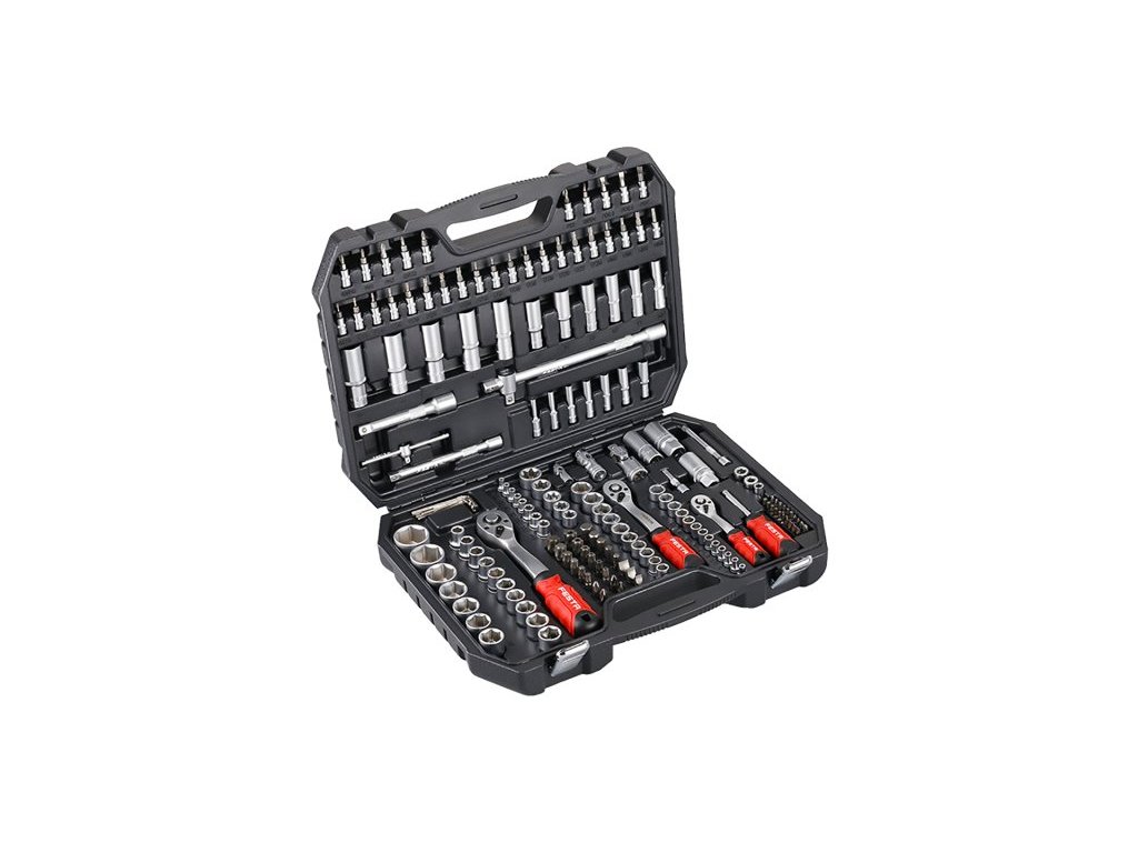 Sada hlavic a nástavců 1/4,3/8,1/2. Všechny části jsou vyrobeny z chrom-vanadiové oceli kováním, dobře kombinovaná sada v přehledném plastovém kufru, ráčny s přepínací páčkou a uvolňovacím tlačítkem, ergonomicky tvarovaná rukojeť.Doplňkové parametry