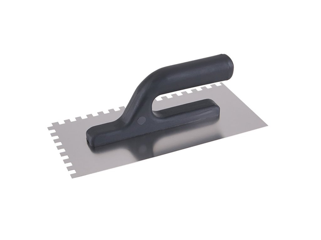 Hladítko nerezové 270x125 mm s plastovou ručkou, zub e8, tl.plechu 0,7 mm. Ostří je perfektně vytvarováno, je vyrobeno z tvrzené nerezové oceli. Používá se zejména k nanášení lepidel pod obklady a dlažby, dále pak k nanášení stěrek, štuků, omítek, tmelů a dalších stavebních hmot.Doplňkové parametry