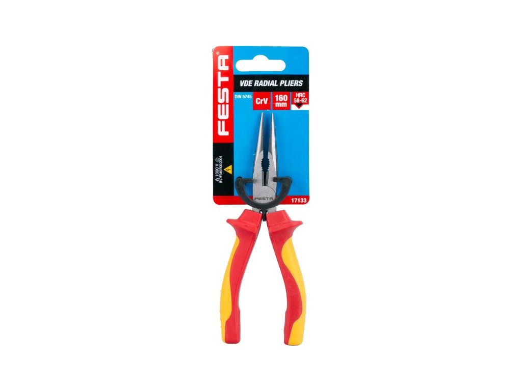 Kleště VDE radiové 160 mm FESTA mají certifikaci elektro VDE 1000 V, IEC/EN 60900-2004, kombinace polypropylenu a pryže na ergonomicky tvarovaných ručkách zaručuje výborné antiskluzové vlastnosti a dobrou odolnost vůči mazadlům a chemikáliím. Uchopovací čelisti obzvláště odolné proti opotřebení, chromvanadová vysoce výkonná ocel. Hmotnost 0,233 kg.Doplňkové parametry