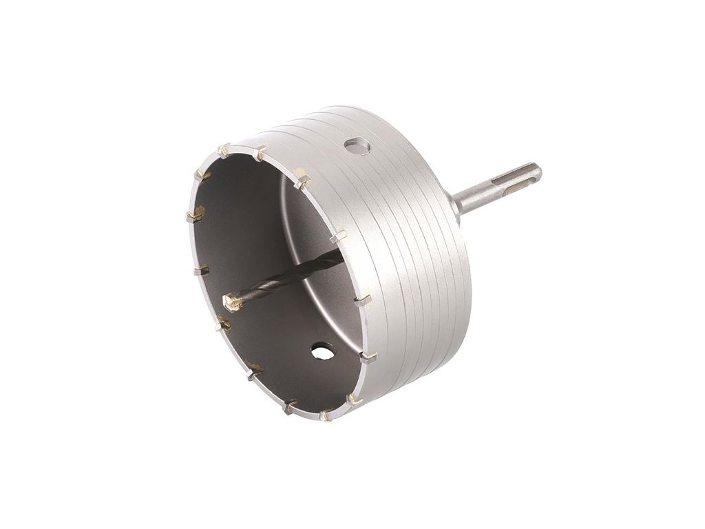 vykružovací / vrtací korunka s SK plátky a vodícím vrtákem uchycení SDS+ kvalitní SK plátky (SK - slinutý karbid), dlouhá životnost, rychlý prostup materiálem vodící - středící vrták usnadňuje práci a korunku přesně vede a drží na požadovaném místě pro vrtání větších průměrů do betonu, porobetonu, cihel a podobných zdících materiálů korunka není vhodná na vrtání železobetonuDoplňkové parametry