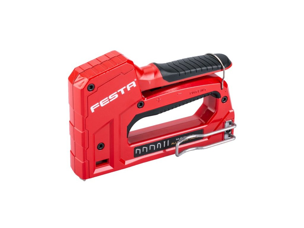 sponkovačka na 5 druhů spon a hřebů tělo ze slitiny hliníku nastavitelná síla úderníku ergonomická pogumovaná rukojeť, aretace bez nutnosti výstřelu spony klip na opasek, průzor na naplnění zásobníku sponami zásobník se spodním plněním pro spony "typ 53" - rozteč hrotů 11,3 / 0,7 mm 6-14 mm, pro spony rozteč hrotů 10,4 - 10,6 / 1,2 mm 8-14 mm, hřeby a hřebíky 15 mmDoplňkové parametry