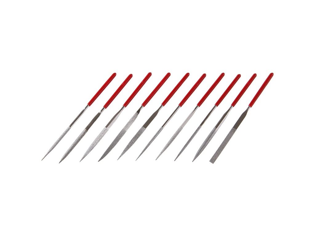 sada diamantových jemných pilníků - 10 kusů délka pracovní části 100 mm obsah sady - plochý, mečový, trojhranný, čtyřhranný, půlkulatý, kulatý, kopinatý použití - tvrdé materiály - ocel, tvrdokov, keramika, sklo, kámenDoplňkové parametry