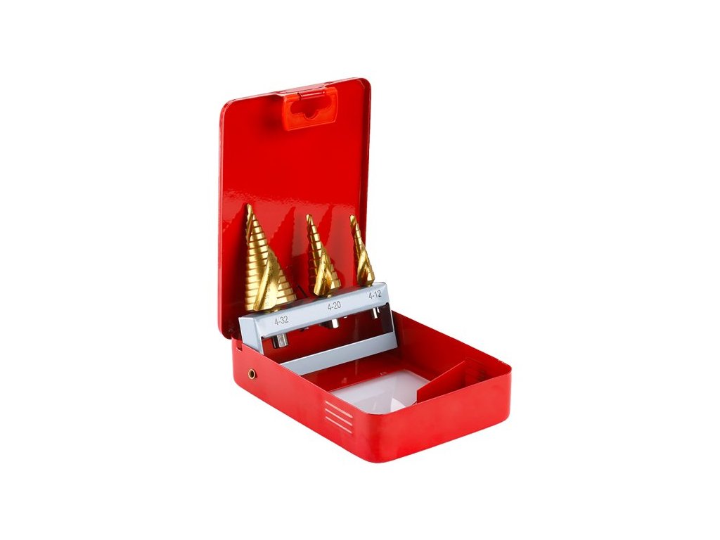 sada stupňovitých vrták z kvalitní HSS oceli DIN 1412C s TiN vrstvou vrstva TiN zvyšuje odolnost a životnost vrtáku pro vrtání slitin a ocelových plátů do tloušťky 4 mm, plastu a dřeva, široké drážky snadno odvedou odvrtaný materiál 4 - 12 / 4 - 20 a 4 - 32 mm, průměry jsou označeny na vrtáku Instruktážní videoDoplňkové parametry