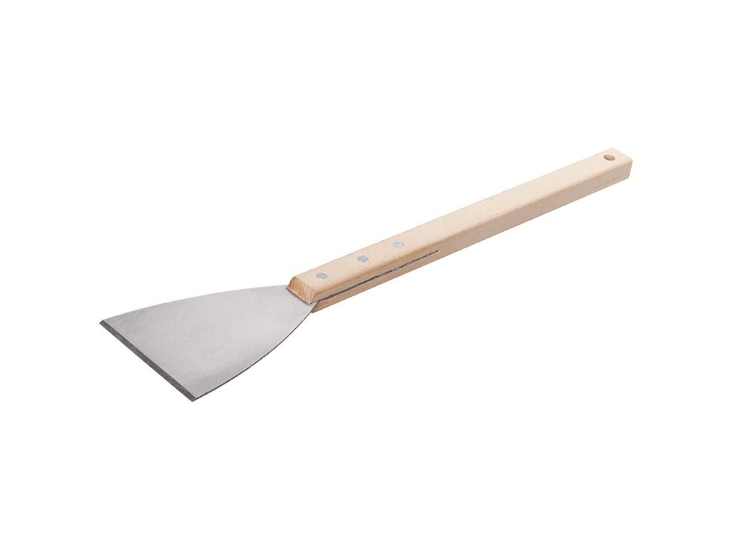 škrabací nerezová špachtle FESTA 100 mm zesílená čepel - tloušťka 2 mm s broušenou hranou kvalitní dřevěná prodloužená rukojeť 350 mm, pro maximální přenos síly obou rukou při práciDoplňkové parametry