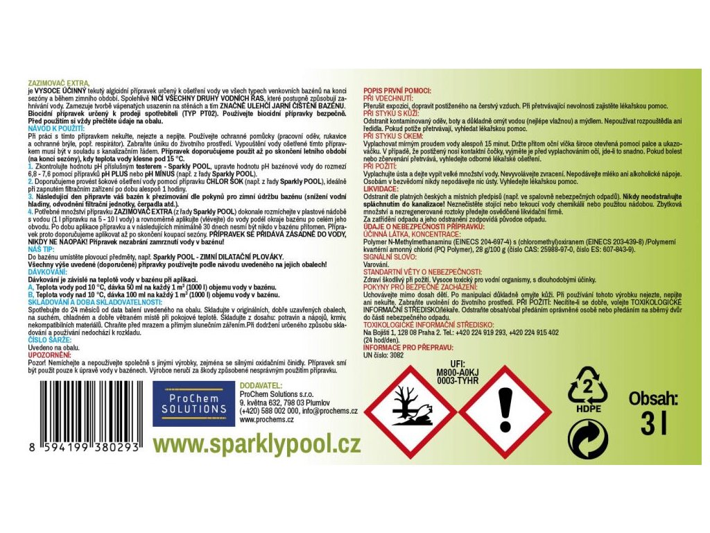 je VYSOCE ÚČINNÝ tekutý algicidní přípravek určený k ošetření vody ve všech typech venkovních bazénů na konci sezóny a během zimního období. Vhodný do bazénu se slanou i sladkou vodou, při používání bezchlorové i chlorové chemie např. bazénové tablety. Spolehlivě NIČÍ VŠECHNY DRUHY VODNÍCH ŘAS, které postupně způsobují zahnívání vody. Zamezuje tvorbě vápenatých usazenin na stěnách a tím ZNAČNĚ ULEHČÍ JARNÍ ČIŠTĚNÍ BAZÉNU.
